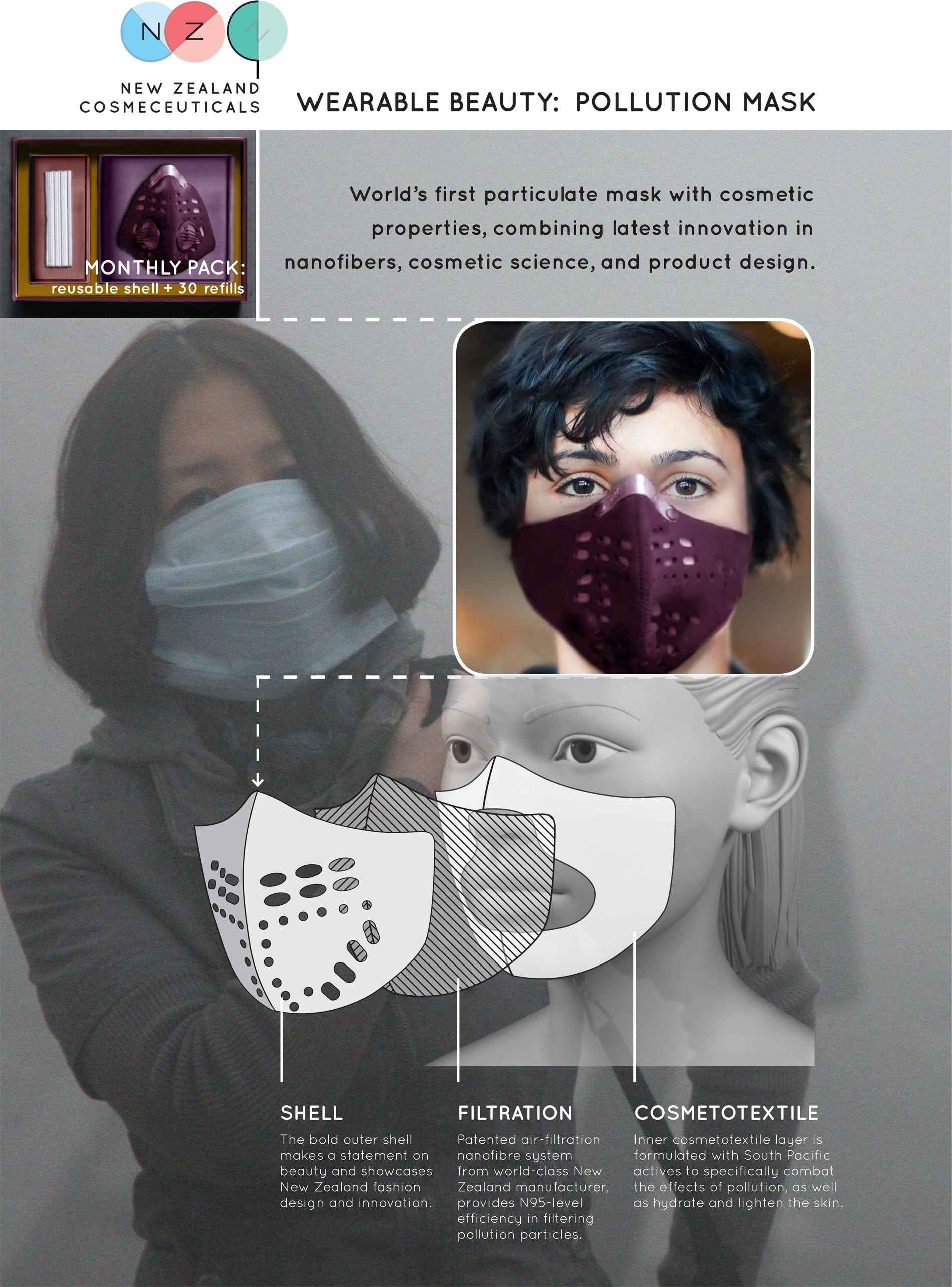 Anti-pollution mask that protects your skin, not just your lungs. Counters the negative effects of regular masks, which leave the skin dry and irritated, as well as the effects of pollution in general. Also, a fashion-item that acknowledges the reality of our polluted and harmful urban condition.