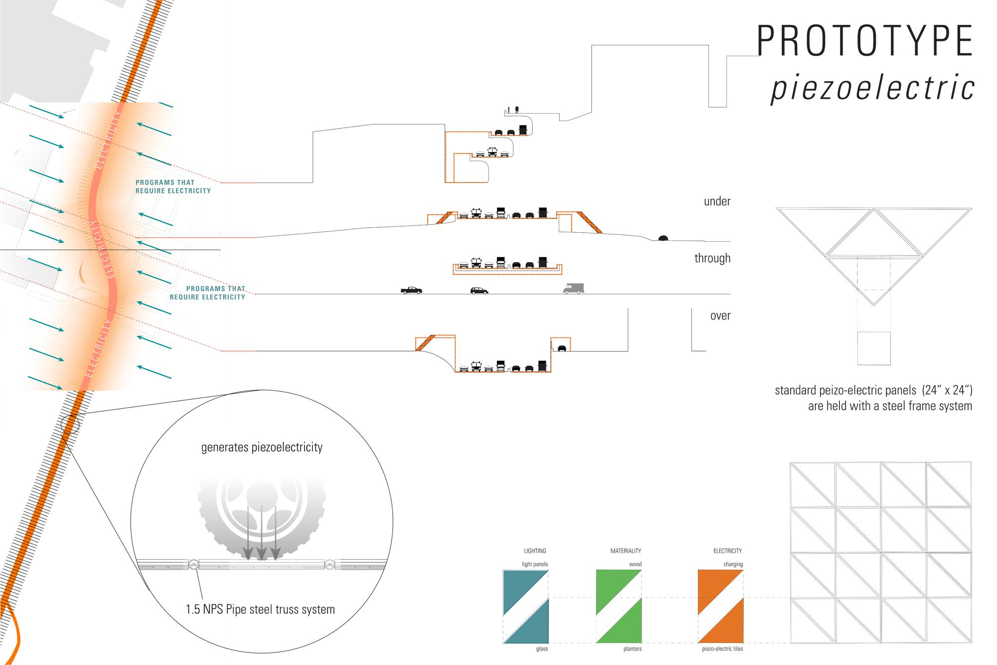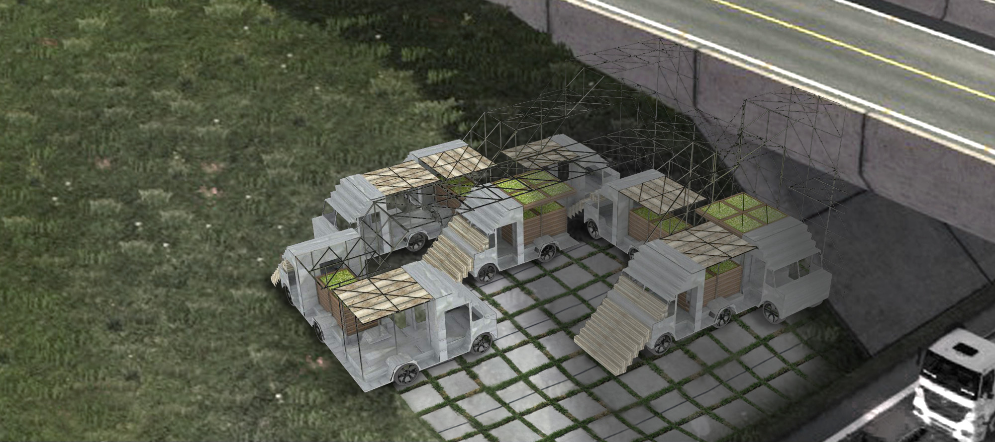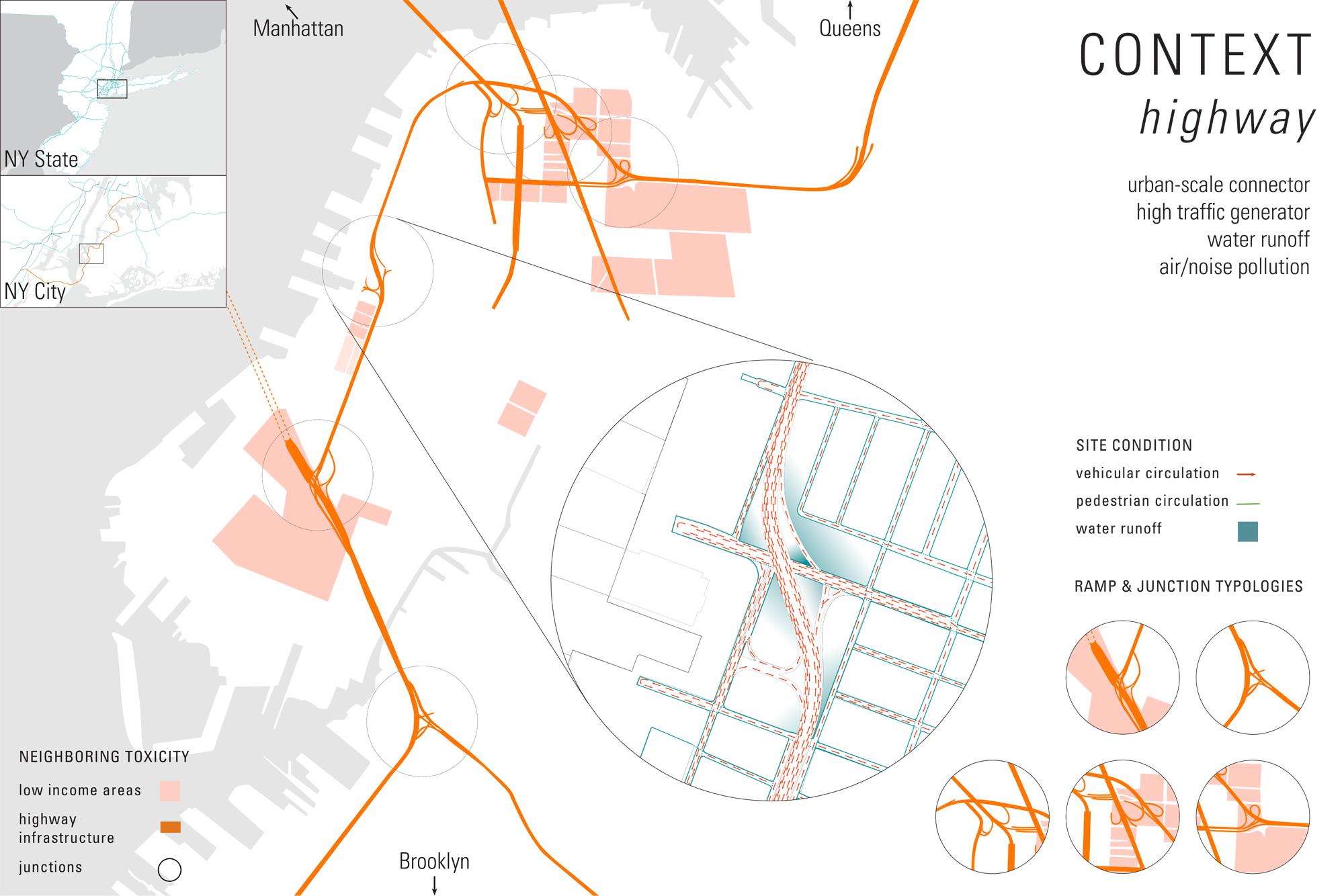 tl;dr: Trucks that unfold to create modular, inhabitable structures powered by piezoelectricity harvested from highways – present potential to re-activate spaces that highways have disconnected. The Brooklyn Heights case study targets the local problem of toxic soil by introducing a phytoremediation plant nursery – filtering and using water runoff from offramps, and utilizing piezoelectricity for germination and irrigation systems.