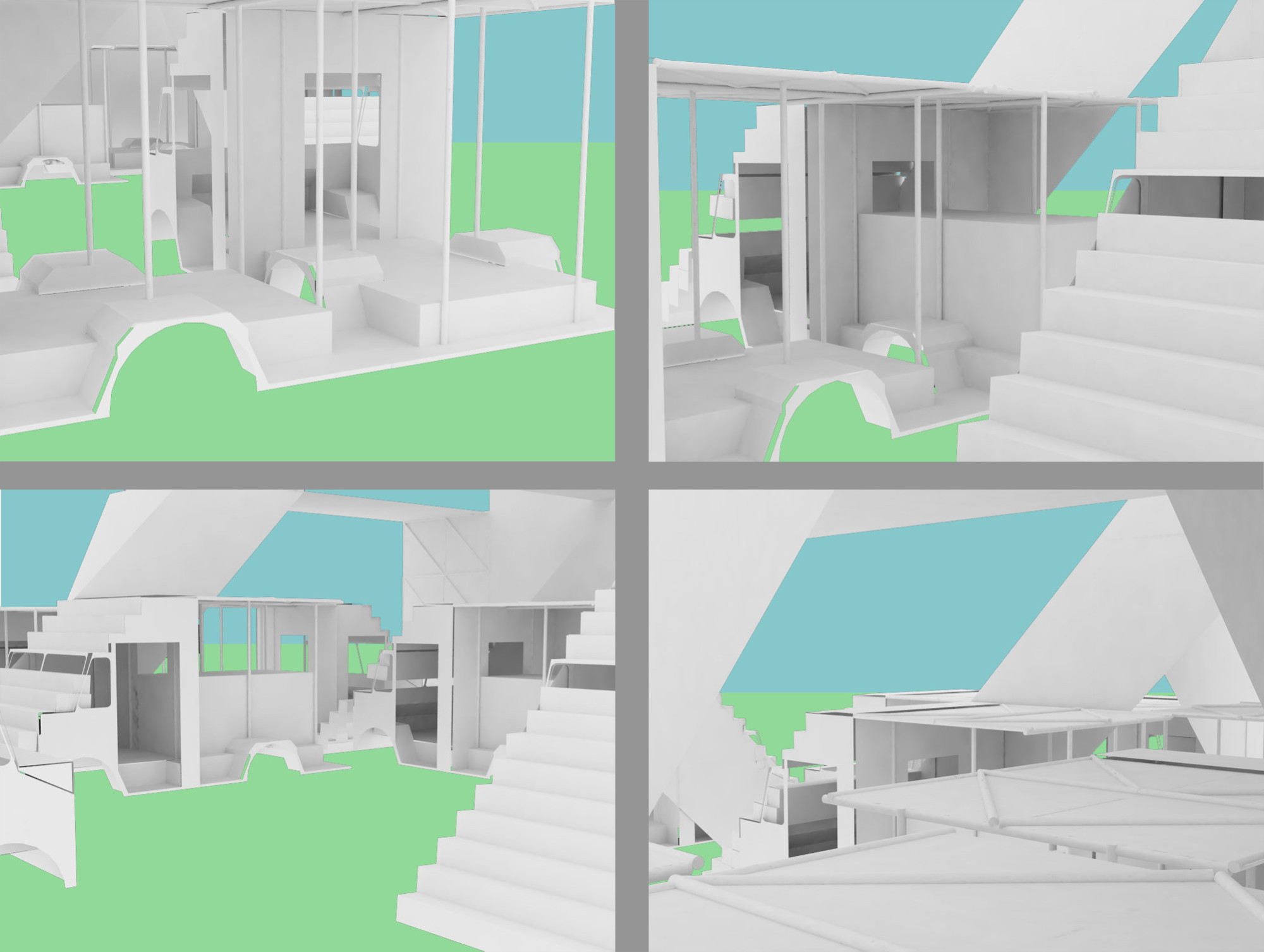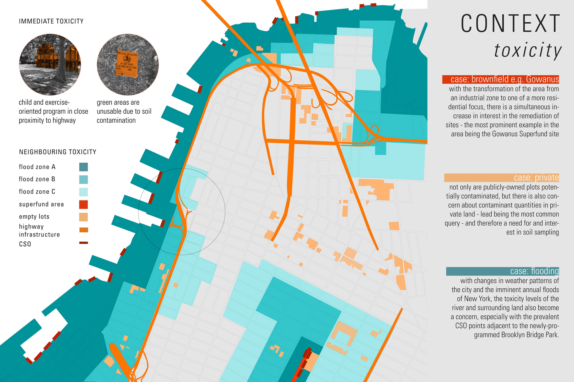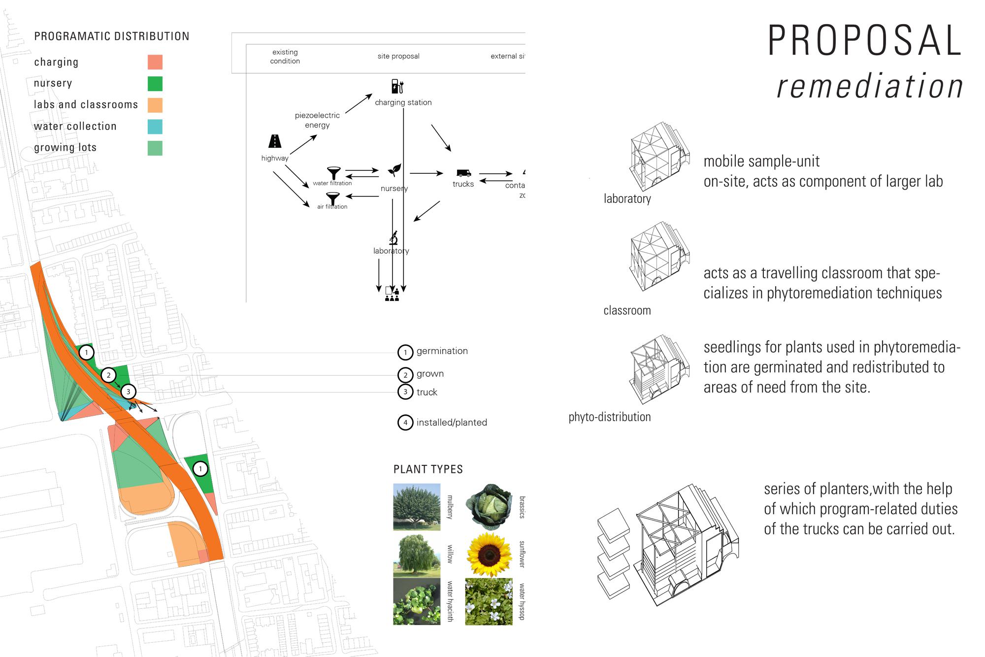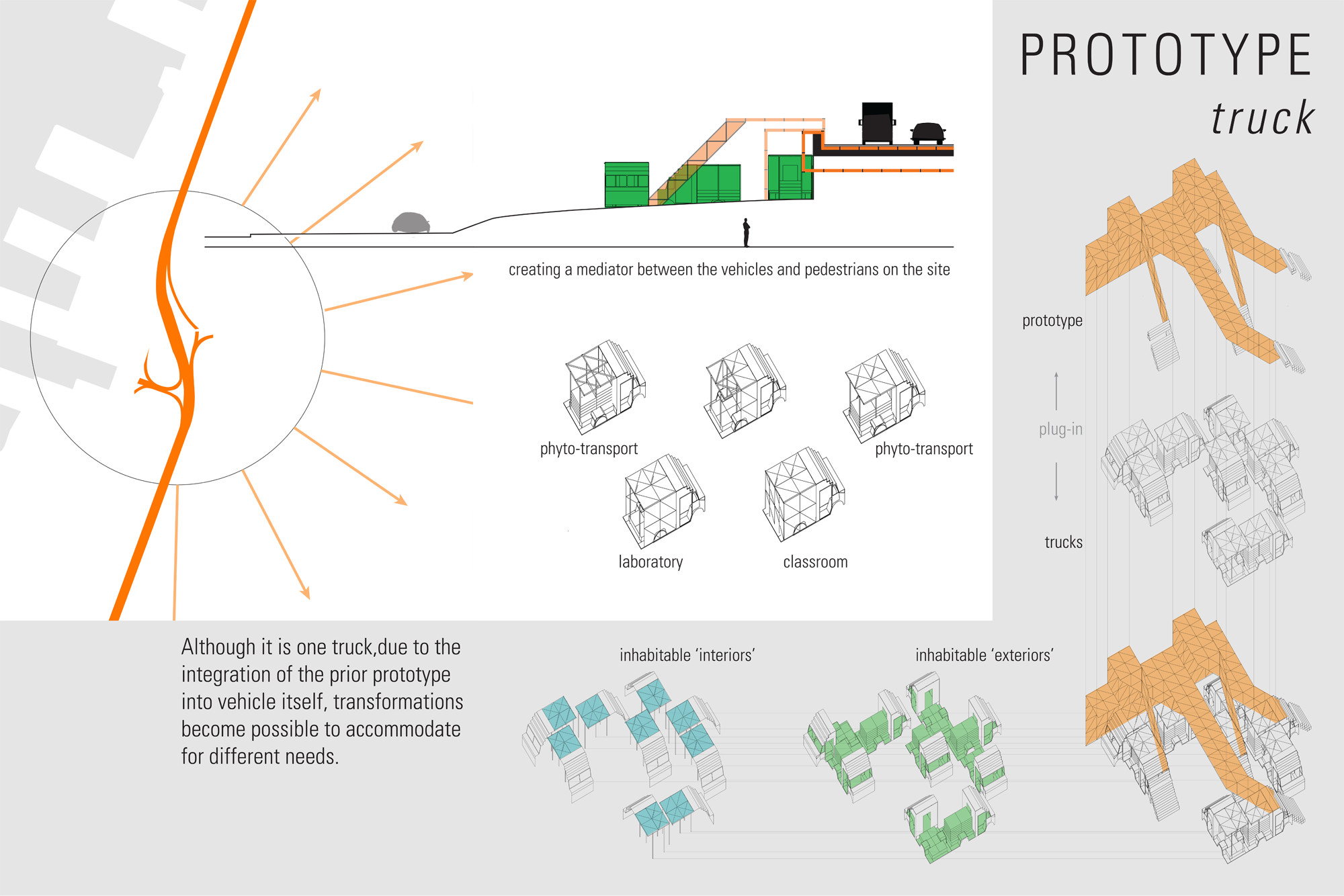 tl;dr: Trucks that unfold to create modular, inhabitable structures powered by piezoelectricity harvested from highways – present potential to re-activate spaces that highways have disconnected. The Brooklyn Heights case study targets the local problem of toxic soil by introducing a phytoremediation plant nursery – filtering and using water runoff from offramps, and utilizing piezoelectricity for germination and irrigation systems.