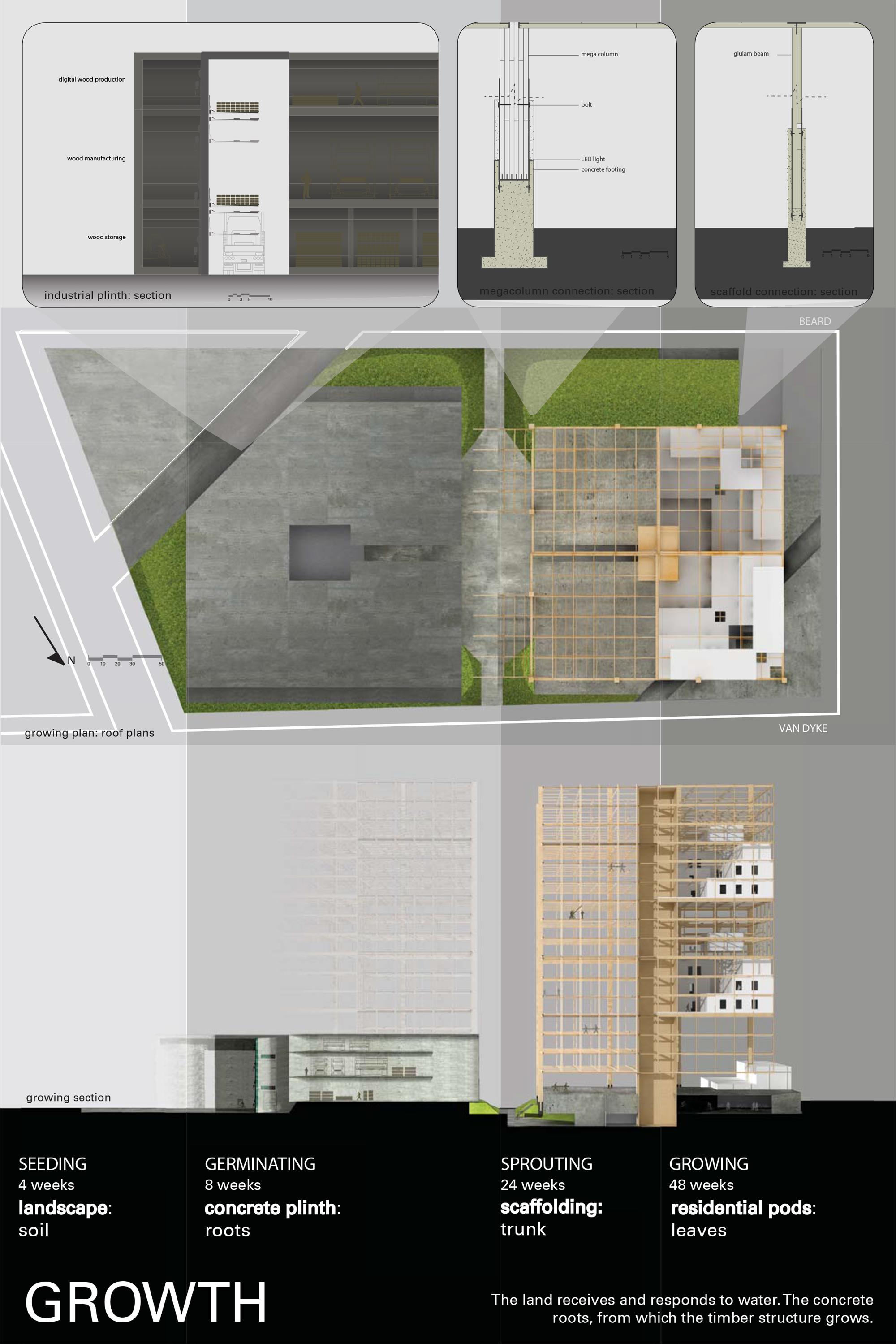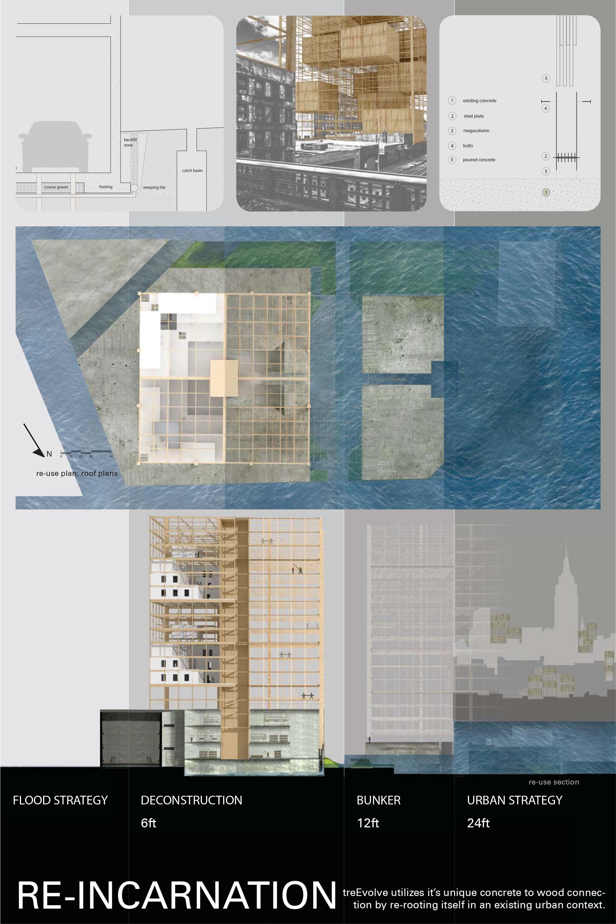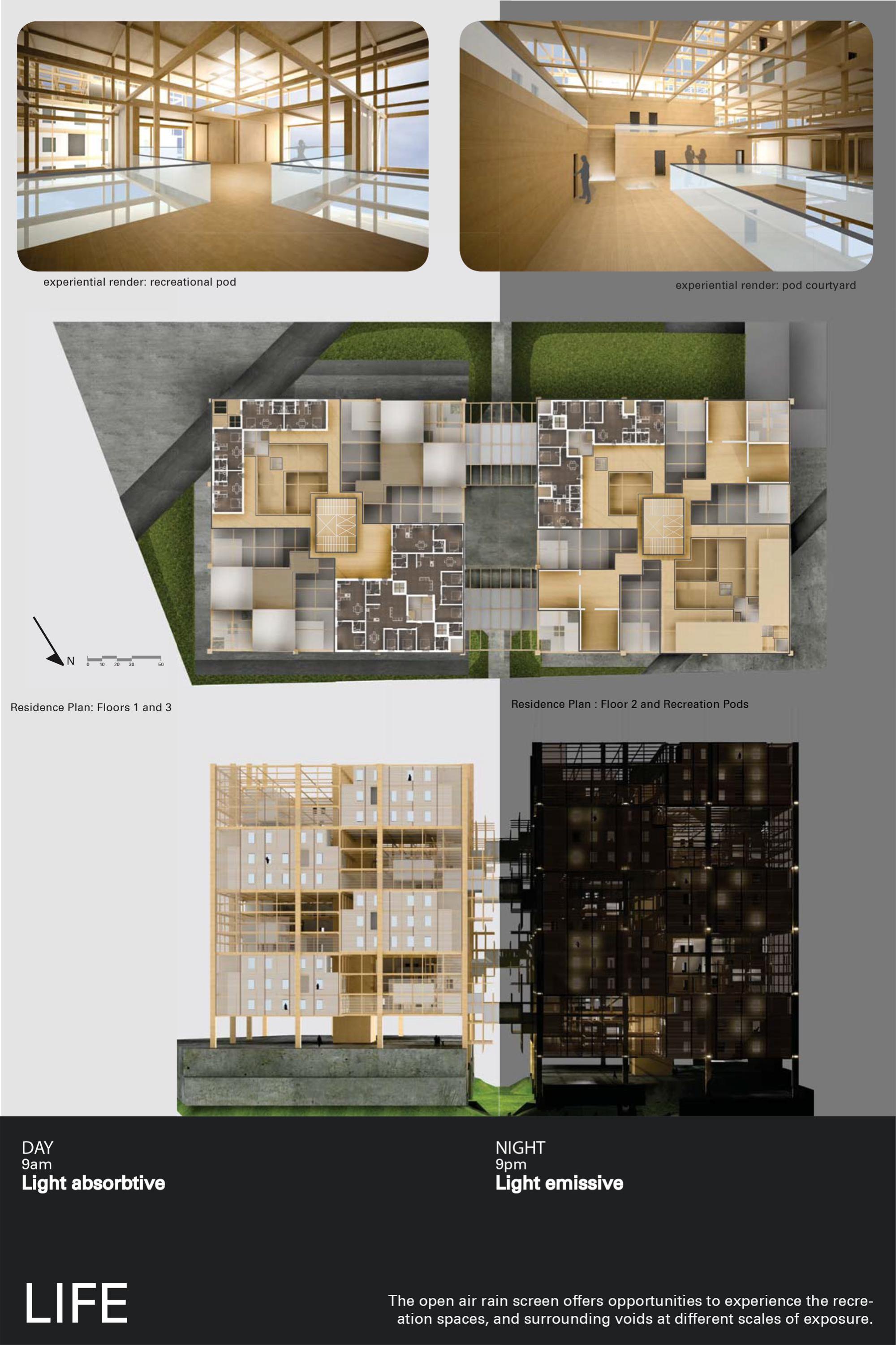 tl;dr: Mixed-use complex for Redhook, New York, using engineered timber. Situated in an area at high flood risk (climate change; hurricanes), there is heavy emphasis on building's life cycle – expressed through a modular system, that can be plugged into existing infrastructure.